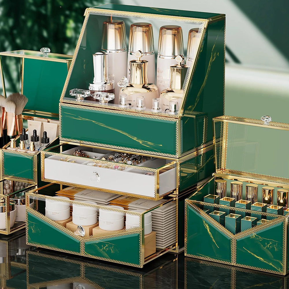 Extra Large Makeup Organizer, Glass Cosmetic Storage with Drawers, Stackable Makeup and Jewelry Organizer for Vanity Table, Bathroom Countertop, Skincare, Lipsticks, Perfume, Brushes(Green)