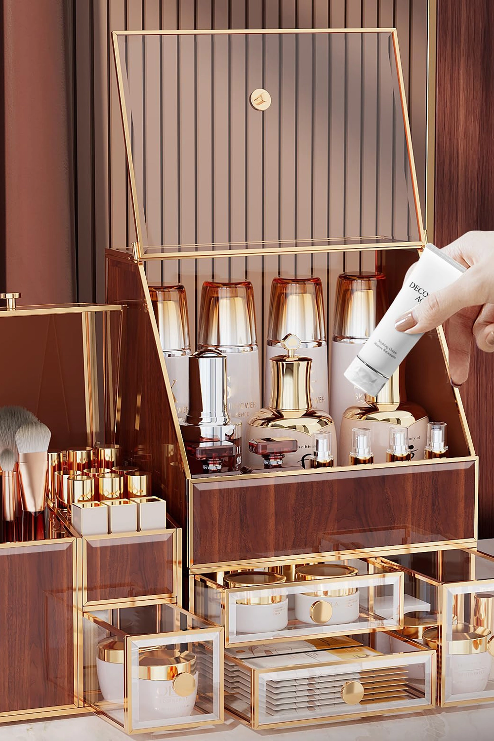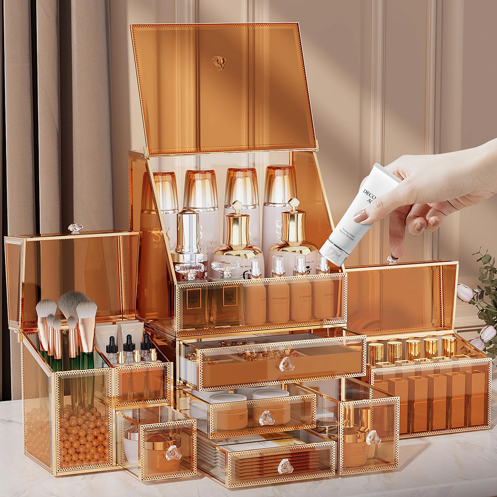 Extra Large Makeup Organizer, Glass Cosmetic Storage with Drawers, Stackable Makeup and Jewelry Organizer for Vanity Table, Bathroom Countertop, Skincare, Lipsticks, Perfume, Brushes(Amber)