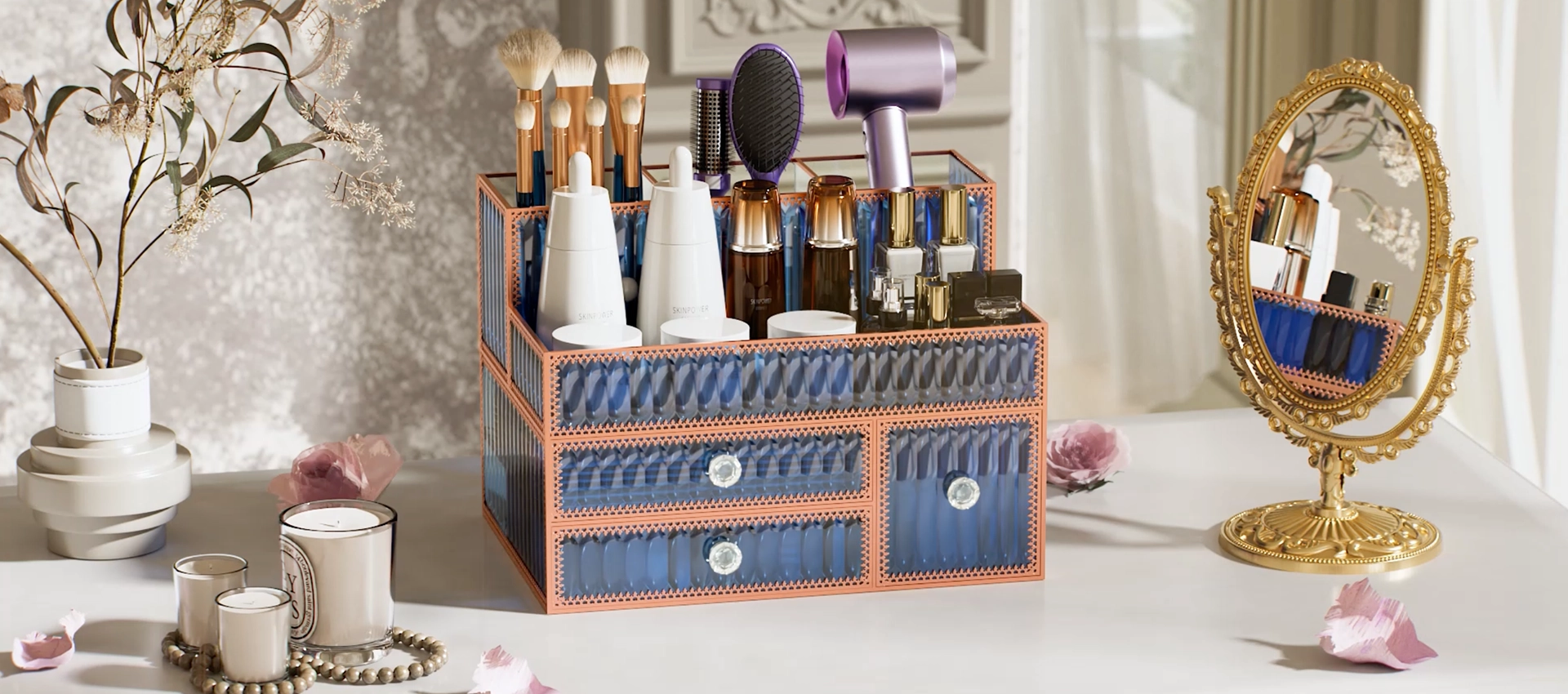 Perfect partitions to store cosmetics, skin care products, makeup brushes, perfumes and small hairdressing tools, so that the dressing table is clutter-free