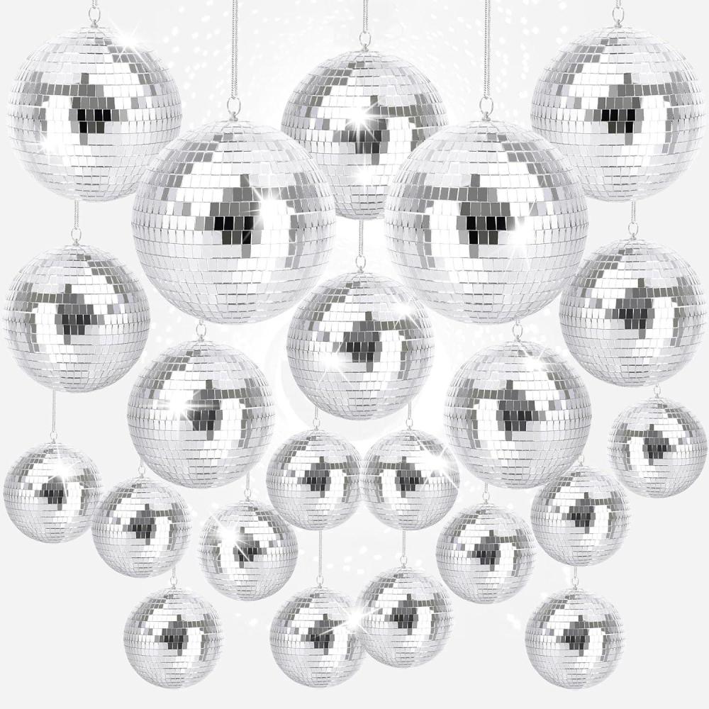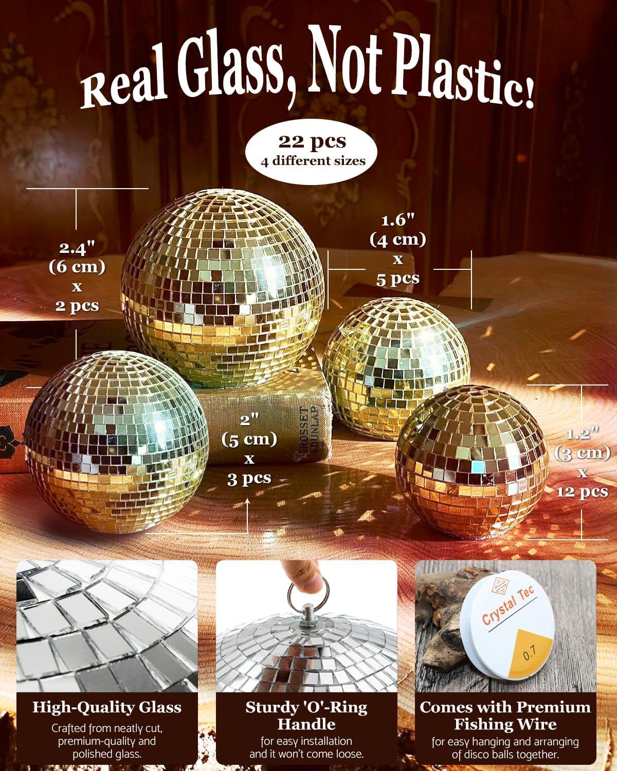 Assorted Sizes for Dimensional Styling Includes 22 reflective balls: 12 x 1.2 inch mini disco balls, 5 x 1.6″, 3 x 2.0″, and 2 x 2.4″ – ideal for layered disco ball room decor and table accents.