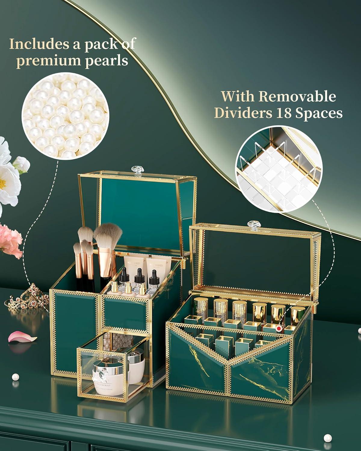 Extra Large Makeup Organizer, Glass Cosmetic Storage with Drawers, Stackable Makeup and Jewelry Organizer for Vanity Table, Bathroom Countertop, Skincare, Lipsticks, Perfume, Brushes(Green)
