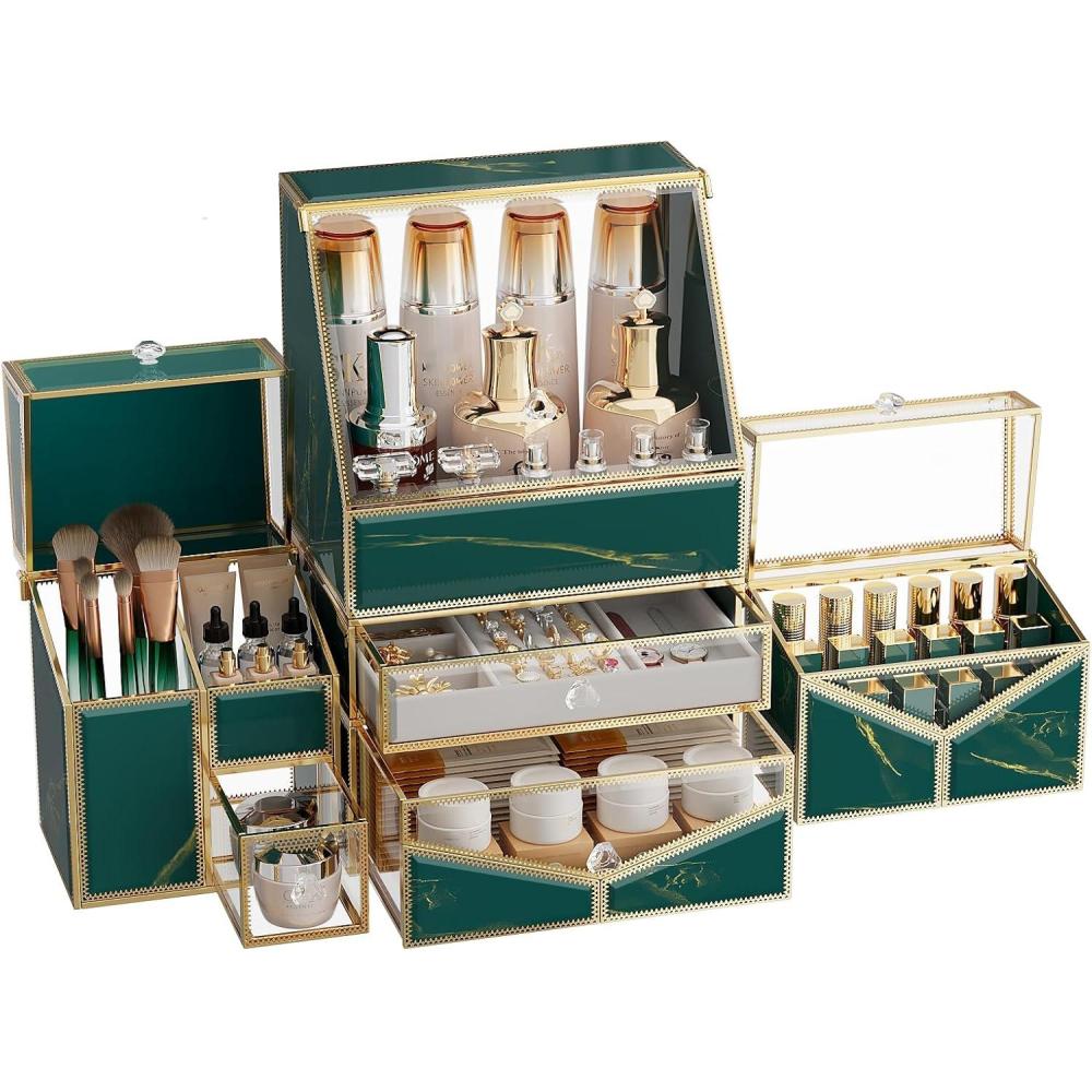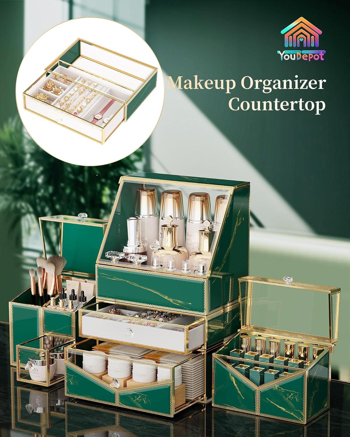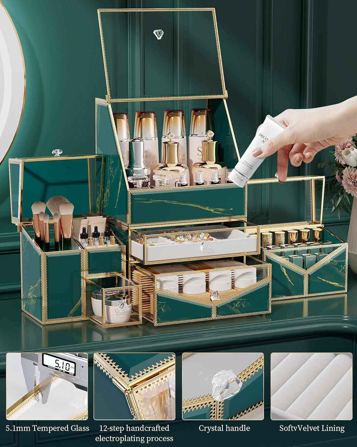 imageExtra Large Makeup Organizer Glass Cosmetic Storage with Drawers Stackable Makeup and Jewelry Organizer for Vanity Table Bathroom Countertop Skincare Lipsticks Perfume BrushesGreen