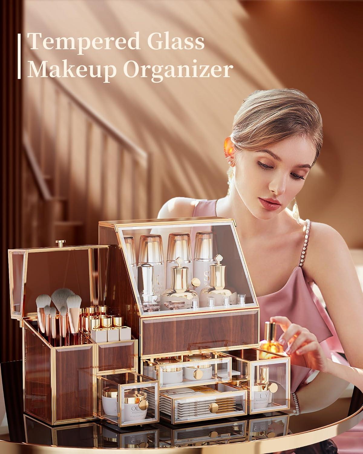 Made of luxury tempered glass double layer plating and handmade, our cosmetics organizer boasts impeccable quality and durability without rusting or fading.