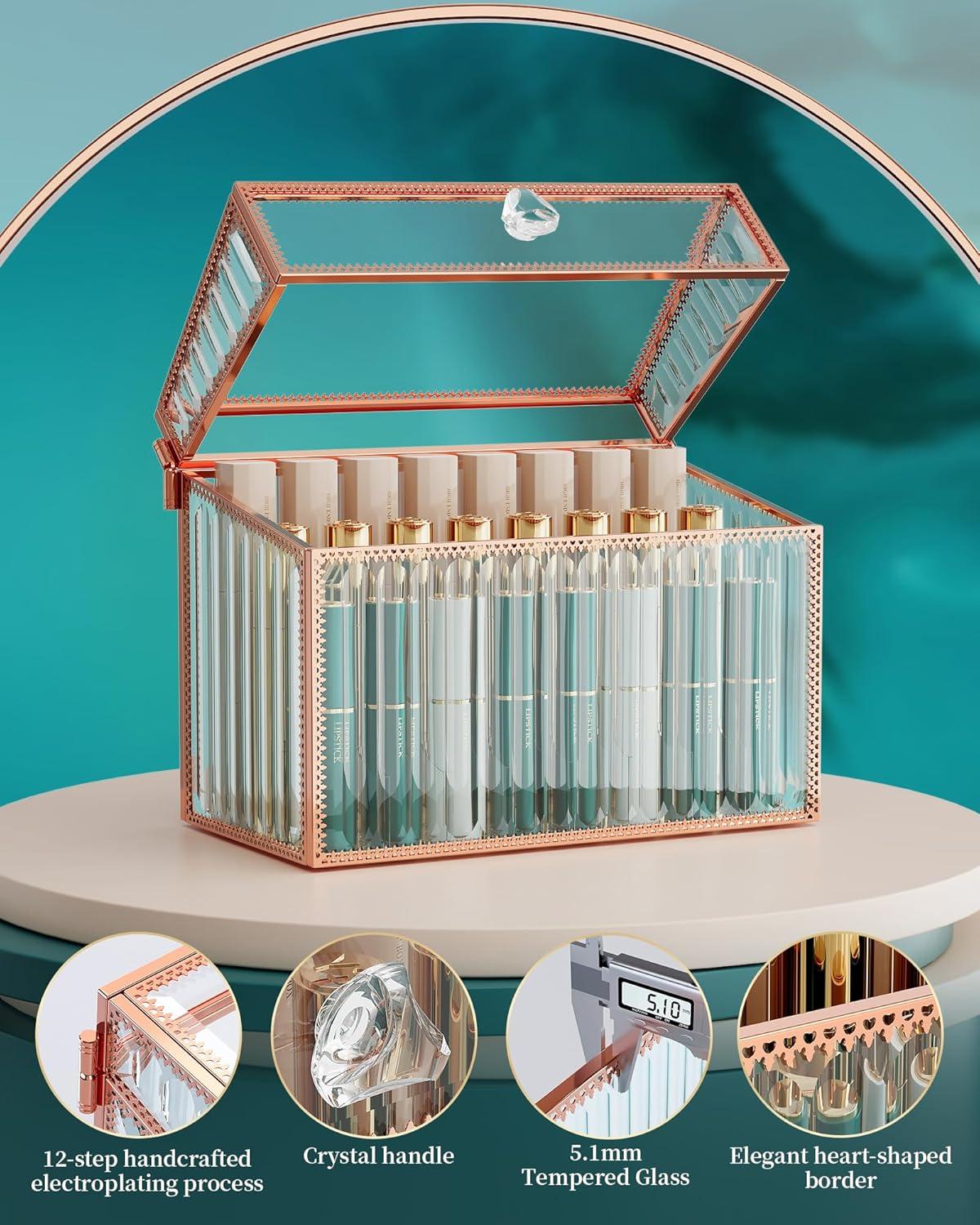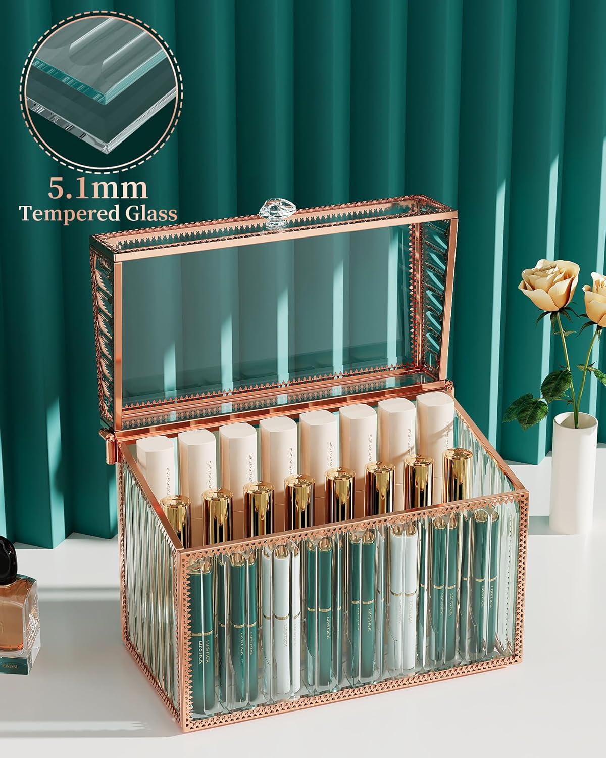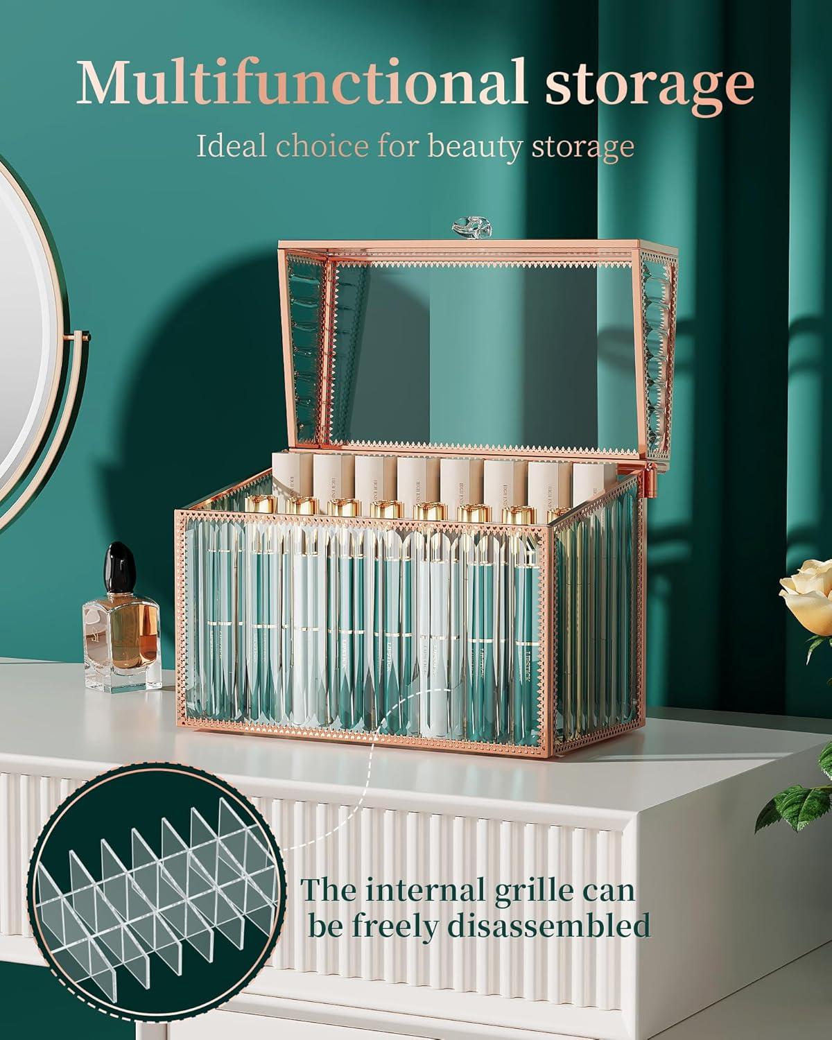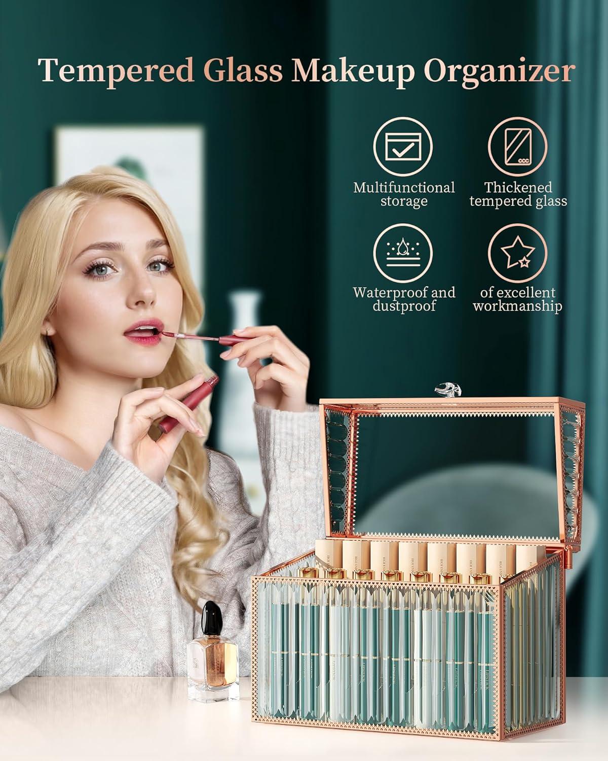 1. Elegant Design: Crafted with double-layer plated, toughened glass and featuring a dust-proof lid, this lipstick organizer combines style with functionality.