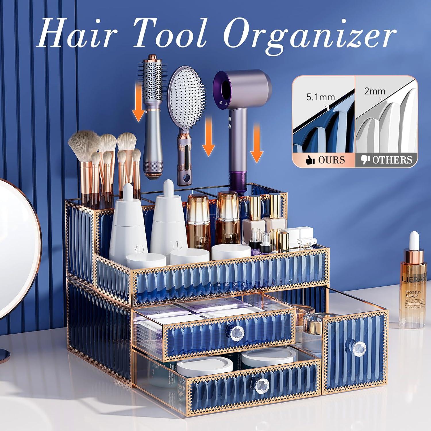 Makeup Organizer Countertop – Tempered Glass Vanity Organizer for Cosmetics, Skincare, Hair Tools, Brushes, Perfume – Multipurpose Bathroom Counter Skincare Organizer(blue)