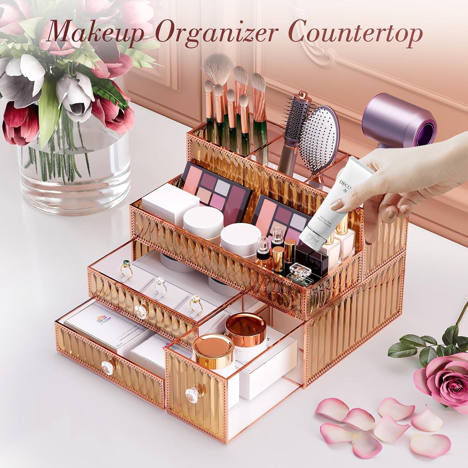 Makeup Organizer Countertop - Tempered Glass Vanity Organizer for Cosmetics, Skincare, Hair Tools, Brushes, Perfume - Multipurpose Bathroom Counter Skincare Organizer(Golden)