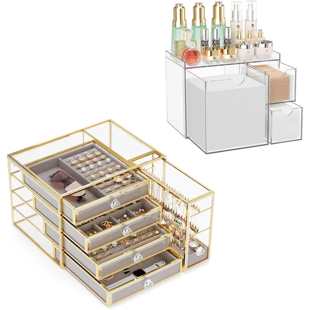 Upgrade your vanity and bathroom storage with this 2-in-1 bundle. The disposable face towel holder features a sleek triple-drawer acrylic design to neatly organize facial towels, cotton pads, and skincare tools. Paired with a luxury glass jewelry box, made from tempered glass with five drawers and velvet lining, this jewelry organizer protects earrings, necklaces, and bracelets while keeping them elegantly displayed. Together, this face towel box and jewelry holder combine modern style and functional storage for everyday convenience.