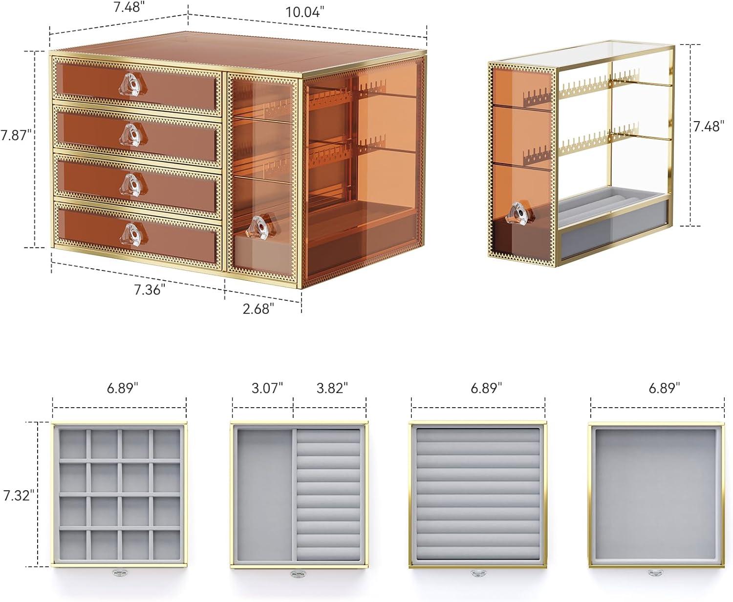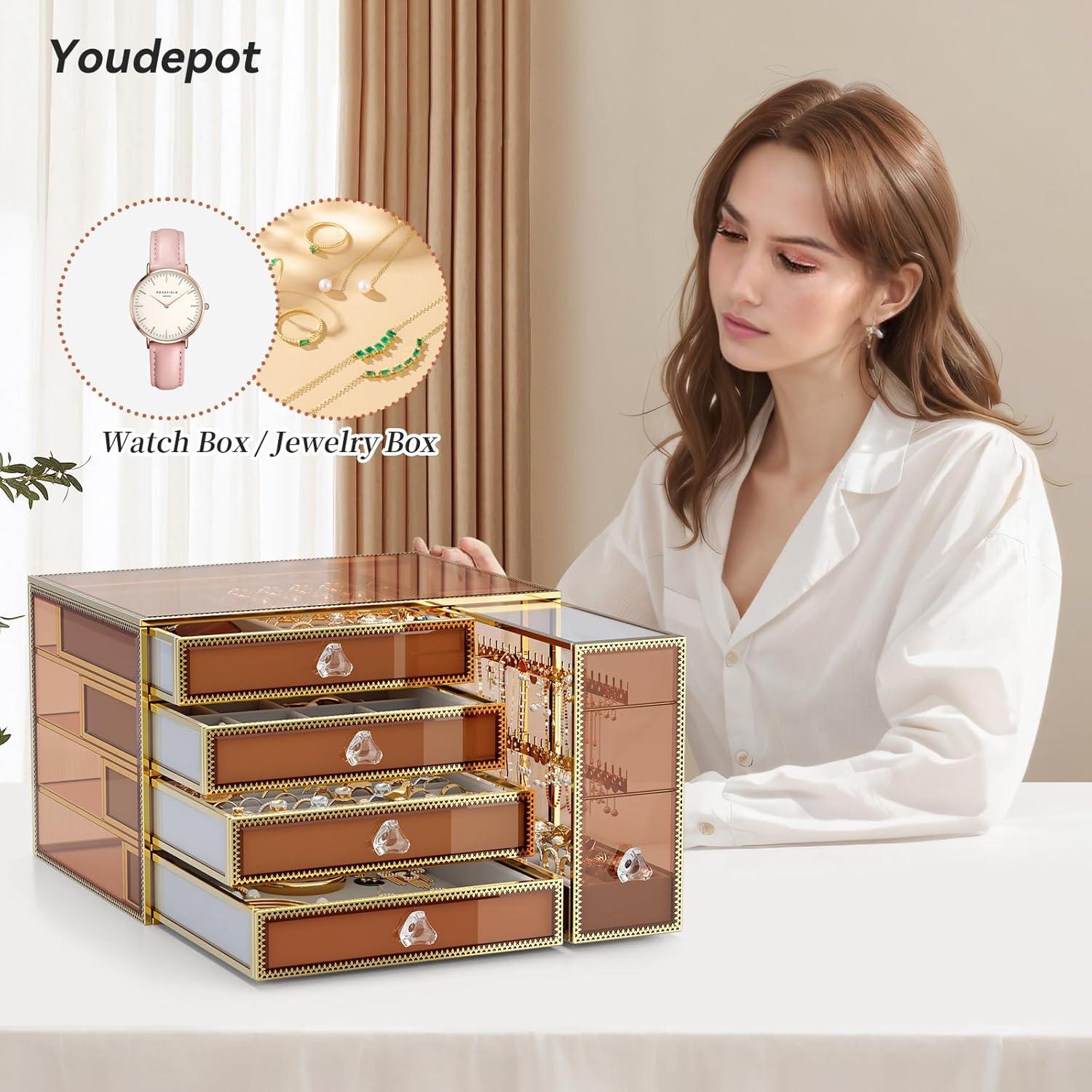 Upgrade your beauty and jewelry storage with the Youdepot Jewelry and Lipstick Organizer, a luxurious and multifunctional solution designed to keep your essentials organized and protected. Handcrafted from premium toughened glass and enhanced with durable double-layer plating, this elegant organizer is resistant to rust and fading, ensuring it remains a stylish addition to your space for years to come. With a generous size, the jewelry organizer measures 10″L x 7.5″W x 7.9″H, providing ample room for watches, earrings, necklaces, and bracelets, while the lipstick organizer measures 9.3″L x 3.8″W x 5.6″H, perfect for storing and displaying your lip glosses and lipsticks. This practical set is ideal for use on bathroom counters, dressers, or any area where you need an organized display. The thoughtful sealed design, complete with gray velvet lining inserts, ensures that your makeup and jewelry are safeguarded from dust, water, and scratches, maintaining their perfect condition. This design not only protects your items but also adds a touch of elegance to the organizer’s appearance. Looking for the perfect gift? The Youdepot Jewelry and Lipstick Organizer is a thoughtful and practical choice for special occasions such as Christmas, birthdays, Valentine’s Day, and Mother’s Day. It’s an ideal present for mothers, wives, daughters, colleagues, and girlfriends who appreciate stylish and organized beauty and jewelry storage solutions. Embrace a more organized and elegant lifestyle with Youdepot’s premium storage solutions, designed to meet all your beauty and jewelry organization needs.