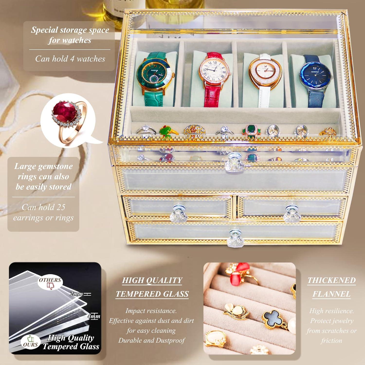 Jewelry organizer box-Tempered Glass 5-Drawer jewelry boxes for women, Large Jewelry Boxes & Organizers With Velvet Necklaces Earring Organizer.